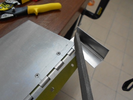 With a cutter, we trimmed the marked edge. Then, we placed a L-angle under the skin, and file the trimmed edge. The L-angle is used to cover the Trim Tab from scratches.